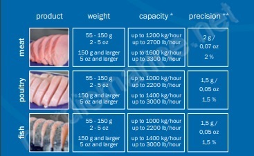 This is the high-speed modern technology machine suitable for portion cutting whole fish, fish fillets and different kinds of meat. Used to work on salmon fish fillets.